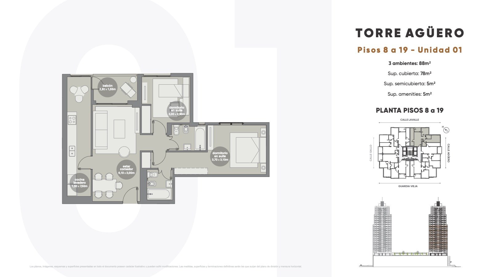 HUMAN ABASTO TOWERS - TORRE AGUERO - DEPARTAMENTO A ESTRENAR DE 3 AMBIENTES CON 2 BAÑOS COMPLETOS - BALCÓN TERRAZA - PISO ALTO CON VISTA PANORÁMICA - SUPER LUMINOSO - SEGURIDAD 24 HS. - NO ACEPTA PERRO - DEMOSTRACIÓN DE INGRESOS Y GARANTIA PROPIETARIA O FIANZA FINAER O GARANTIA YA - CONTRATO A 2 AÑOS CON AJUSTES TRIMESTRALES AL IPC - POSESIÓN INMEDIATA Acceso a planta baja • Parámetros con revoques rústico • Piso de porcelanato. • Escaleras generales: escalones de hormigón fratazado, pasamanos de hierro, con terminación de pintura sintética. • Hall de entrada: diseño moderno y piso de porcelanato Instalaciones: Instalación eléctrica: • Portero eléctrico: con intercomunicador en cada unidad • Provisión y colocación de artefactos de iluminación en planta baja y en espacios comunes, escaleras y balcones. Instalación sanitaria • El agua caliente: sistema central por termotanques de alta recuperación. Instalación de gas • Caño galvanizado con recubrimiento epoxi para los termotanques de agua caliente centrales. • Espacio para el medidor: ubicado sobre línea oficial según normativas. Instalación contra incendio • Según normas municipales vigentes. Amenities que en un futuro tendrá: • Piscina con solarium • Gimnasio • Salón de usos múltiples • Sector parrillas • Cancha de fútbol • Cancha de básquet • Cancha de tenis • Juegos de niños. • Sendero aeróbico • Laundry • Microcine. • Kids club • Cowork room • Spa 3 en 1 Terminaciones: CARPINTERÍAS 1. Ventanas y puertas ventanas • Aluminio línea modena o similar. • Vidrios laminados según cálculo por dimensión de la carpintería. 2. Puertas de acceso a unidades • Marco de chapa nº 18. Terminación: antióxido (una capa) y sintético (dos capas). • Hoja de madera para pintar, cerradura de doble paleta. • Cerradura electrónica. 3. Puertas interiores • Marco de chapa nº 18. • Puerta placa pintadas con esmalte sintético. • Herrajes línea sanatorio o similar. Bisagras pomelas para pintar. 4. Frente de placard • Puertas corredizas en melamina con perfil de aluminio liviano. INSTALACIONES 1. Instalación eléctrica • Tablero y puesta a tierra según normas del ente regulador. • Línea de tomas y puntos marca Jeluz verona o similar. 2. Instalación sanitaria • La distribución de agua caliente en las unidades: caño de termofusión marca Acqua-System, hidro 3 o similar. • Los desagües cloacales: caño marca Awaduct de saladillo o similar. 3. Calefacción • Sistema individual por piso radiante eléctrico en todos los ambientes. • Pre-instalación para aire acondicionado para equipos multisplit. Sin provisión ni instalación de equipos. TERMINACIÓN INTERIOR UNIDADES 1. Hall de acceso /estar comedor • Piso de porcelanato. • Cielorraso: placa roca de yeso, aplicados de yeso, fijador (una capa) y látex para cielorrasos (dos capas). • Paredes: placa roca de yeso. Terminación: fijador (una capa) y látex para interior (dos capas). 2. Dormitorios • Piso: carpeta (apta para recibir piso flotante, alfombra o porcelanato). • Cielorraso: placa roca de yeso, aplicados de yeso, fijador (una capa) y látex para cielorrasos (dos capas). • Paredes: placa roca de yeso. Terminación: fijador (una capa) y látex para interior (dos capas). Consúltenos: ciudad de la paz 1978 belgrano@caian.com.ar teléfono: 11 4784 4444 Seguínos en Instagram @caianbelgrano.nordelta Martillero Responsable: Juan Manuel Caian Matrícula 4689 CPI / 6668 CMCPSI