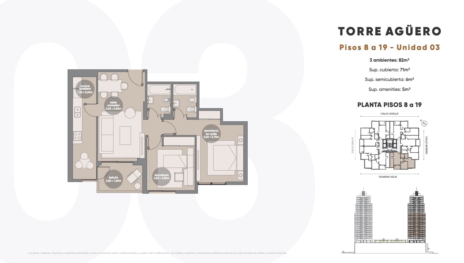 HUMAN ABASTO TOWERS - TORRE AGUERO - DEPARTAMENTO A ESTRENAR DE 3 AMBIENTES CON 2 BAÑOS COMPLETOS - BALCÓN TERRAZA - PISO ALTO CON VISTA PANORÁMICA - SUPER LUMINOSO - SEGURIDAD 24 HS. - NO ACEPTA PERRO - DEMOSTRACIÓN DE INGRESOS Y GARANTIA PROPIETARIA O FIANZA FINAER O GARANTIA YA - CONTRATO A 2 AÑOS CON AJUSTES TRIMESTRALES AL IPC - POSESIÓN INMEDIATA Acceso a planta baja • Parámetros con revoques rústico • Piso de porcelanato. • Escaleras generales: escalones de hormigón fratazado, pasamanos de hierro, con terminación de pintura sintética. • Hall de entrada: diseño moderno y piso de porcelanato Instalaciones: Instalación eléctrica: • Portero eléctrico: con intercomunicador en cada unidad • Provisión y colocación de artefactos de iluminación en planta baja y en espacios comunes, escaleras y balcones. Instalación sanitaria • El agua caliente: sistema central por termotanques de alta recuperación. Instalación de gas • Caño galvanizado con recubrimiento epoxi para los termotanques de agua caliente centrales. • Espacio para el medidor: ubicado sobre línea oficial según normativas. Instalación contra incendio • Según normas municipales vigentes. Amenities que en un futuro tendrá: • Piscina con solarium • Gimnasio • Salón de usos múltiples • Sector parrillas • Cancha de fútbol • Cancha de básquet • Cancha de tenis • Juegos de niños. • Sendero aeróbico • Laundry • Microcine. • Kids club • Cowork room • Spa 3 en 1 Terminaciones: CARPINTERÍAS 1. Ventanas y puertas ventanas • Aluminio línea modena o similar. • Vidrios laminados según cálculo por dimensión de la carpintería. 2. Puertas de acceso a unidades • Marco de chapa nº 18. Terminación: antióxido (una capa) y sintético (dos capas). • Hoja de madera para pintar, cerradura de doble paleta. • Cerradura electrónica. 3. Puertas interiores • Marco de chapa nº 18. • Puerta placa pintadas con esmalte sintético. • Herrajes línea sanatorio o similar. Bisagras pomelas para pintar. 4. Frente de placard • Puertas corredizas en melamina con perfil de aluminio liviano. INSTALACIONES 1. Instalación eléctrica • Tablero y puesta a tierra según normas del ente regulador. • Línea de tomas y puntos marca Jeluz verona o similar. 2. Instalación sanitaria • La distribución de agua caliente en las unidades: caño de termofusión marca Acqua-System, hidro 3 o similar. • Los desagües cloacales: caño marca Awaduct de saladillo o similar. 3. Calefacción • Sistema individual por piso radiante eléctrico en todos los ambientes. • Pre-instalación para aire acondicionado para equipos multisplit. Sin provisión ni instalación de equipos. TERMINACIÓN INTERIOR UNIDADES 1. Hall de acceso /estar comedor • Piso de porcelanato. • Cielorraso: placa roca de yeso, aplicados de yeso, fijador (una capa) y látex para cielorrasos (dos capas). • Paredes: placa roca de yeso. Terminación: fijador (una capa) y látex para interior (dos capas). 2. Dormitorios • Piso: carpeta (apta para recibir piso flotante, alfombra o porcelanato). • Cielorraso: placa roca de yeso, aplicados de yeso, fijador (una capa) y látex para cielorrasos (dos capas). • Paredes: placa roca de yeso. Terminación: fijador (una capa) y látex para interior (dos capas). Consúltenos: ciudad de la paz 1978 belgrano@caian.com.ar teléfono: 11 4784 4444 Seguínos en Instagram @caianbelgrano.nordelta Martillero Responsable: Juan Manuel Caian Matrícula 4689 CPI / 6668 CMCPSI